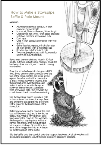 Because the baffles were not rigidly secured to the pole, they were able to sway slightly in the event a predator tried to climb up the pipe—the instability of the pipe serving as an additional deterrent to predators. Recent evidence also shows that the guard is best placed directly under the nest box which would normally prevent all but the largest snakes (6’+) from accessing the boxes. Moreover, the hardware cloth was used in an attempt to draw predators, such as snakes, up into the baffle (rather than along the exterior of the baffle) where their upward progress would be halted by the hardware cloth.
