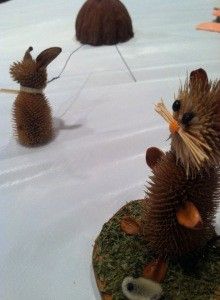 I got to inspect some of her critters, and I was amazed that every single piece was made from natural materials. She said that a walk in the woods has takenon a new meaning, and I can see why! One of her newest tricks is to soak a certain type of weed, which dissolves in water, and leaves behind tiny black ‘beads.’ These beads have become eyes in many of her critters! And, when making critters, beware, because living critters such as mice enjoy chomping on seeds and various natural materials which serve as critter parts. Protect your little critters!