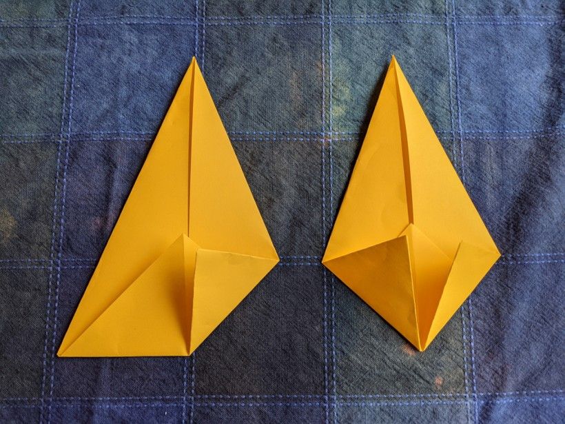 When you have all five papers folded it is time to glue them together. Unfold your pieces along the long center line and apply glue to the two smaller inner triangles. Make sure you cover the whole triangle with glue so the edges stay together nicely.