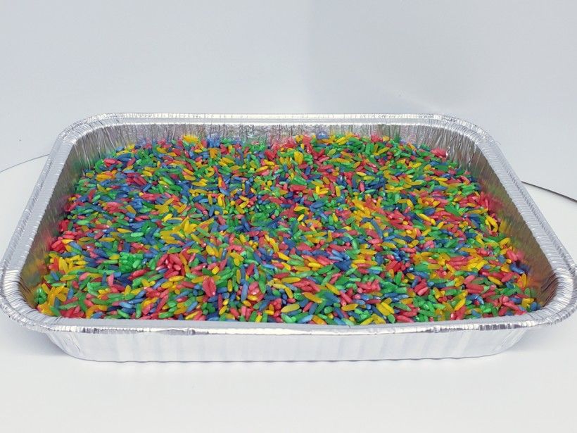 Once you have all the rice dyed, lay it out to dry. (I find that the vinegar dries quickly so this should only take about 15 to 20 minutes).