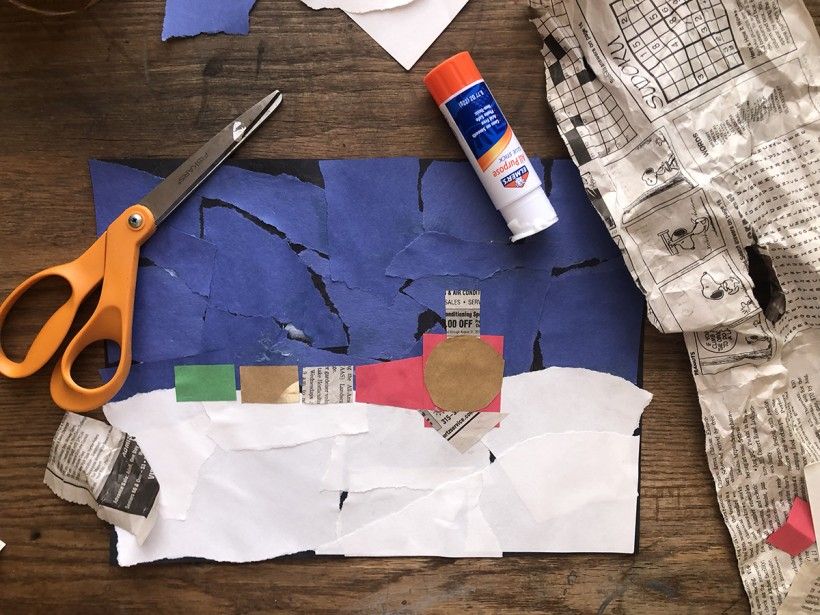 This scene takes place on a snowy night! Start by ripping up white and blue pieces of construction paper into various organic shapes and sizes. Then you’ll want to fit, layer and glue your organic blue and white shapes onto black paper. The top half should be dedicated to blue paper and the bottom half should be white. Be sure to leave some of the black paper showing to allow more color variation and texture. This will make your final scene more interesting!